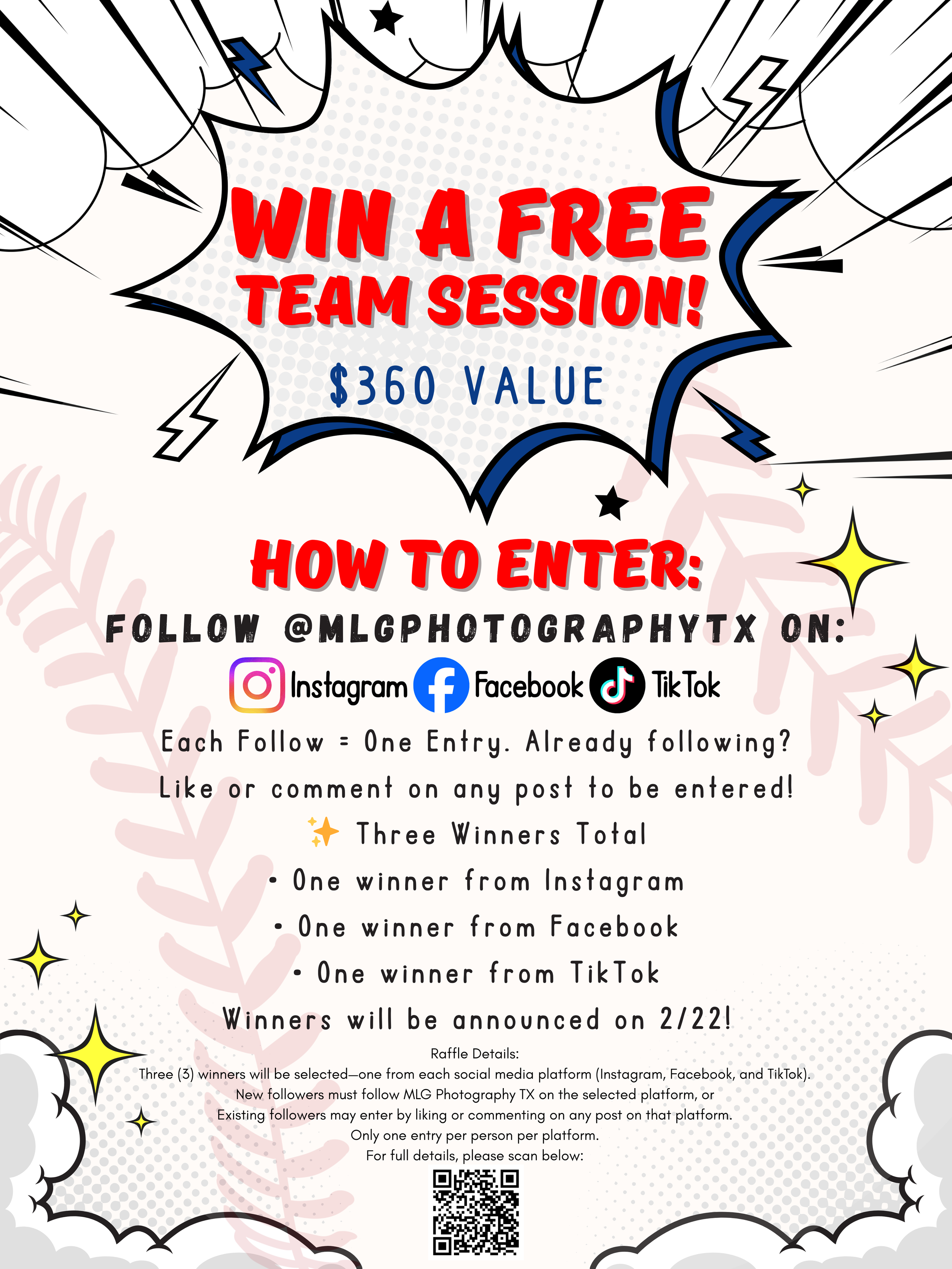 • Each winner will receive a unique booking code to be entered at checkout when scheduling their session through MLG Photography TX’s website.